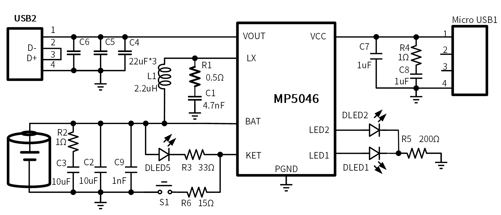 MP5046 is a single-chip IC specially designed for power bank, highly integrating switch charger, LED battery display cell and synchronous boost output, with charging current up to 2A and synchronous boost output up to 2.4A. It also provides discharge path management, battery display, torch, greatly simplifying peripheral circuits and components, and providing the simplest low-cost solution for power bank applications such as large-capacity lithium battery (lithium ion or lithium polymer).