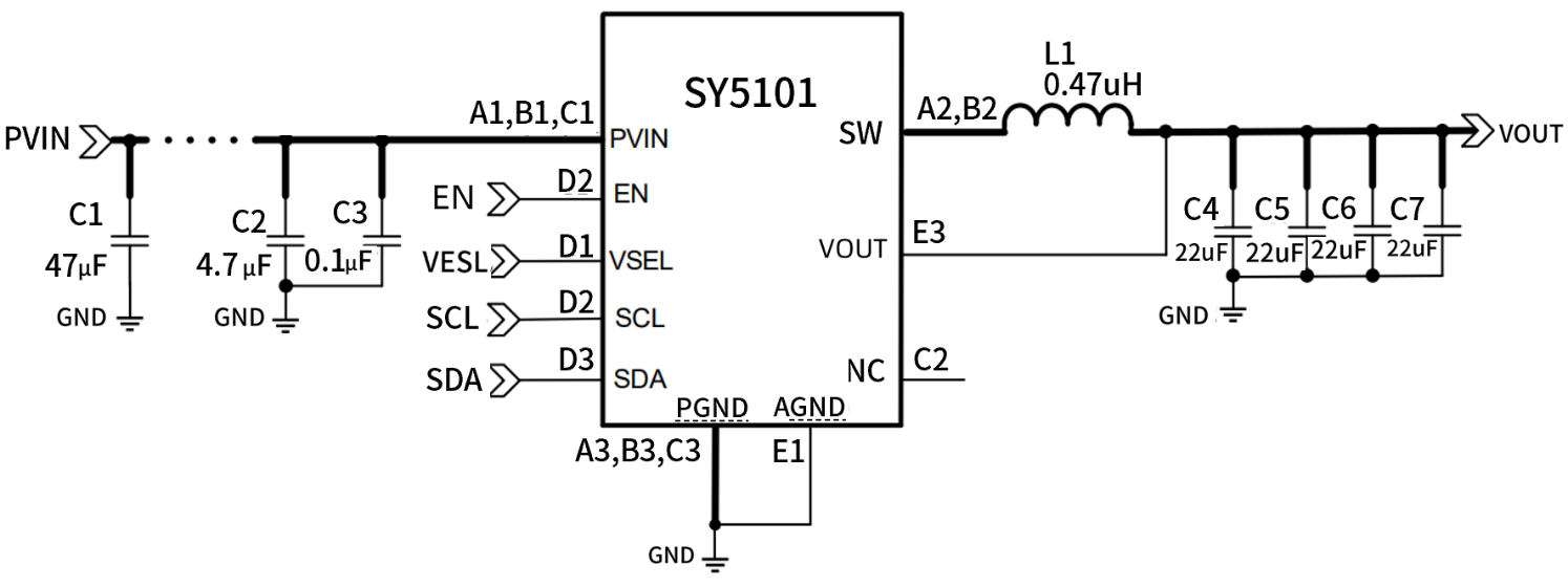 SY5101支持3A的输出电流,且保持高达80%效率工作,在低电流时(<10mA),也能保证80%的转化效率。SY5101在PWM模式下定频工作在2.4MHz,较高的工作频率可以使用较低感值电感,以满足输出电压纹波与环路稳定的要求,推介使用0.33uH或者0.47uH的电感。