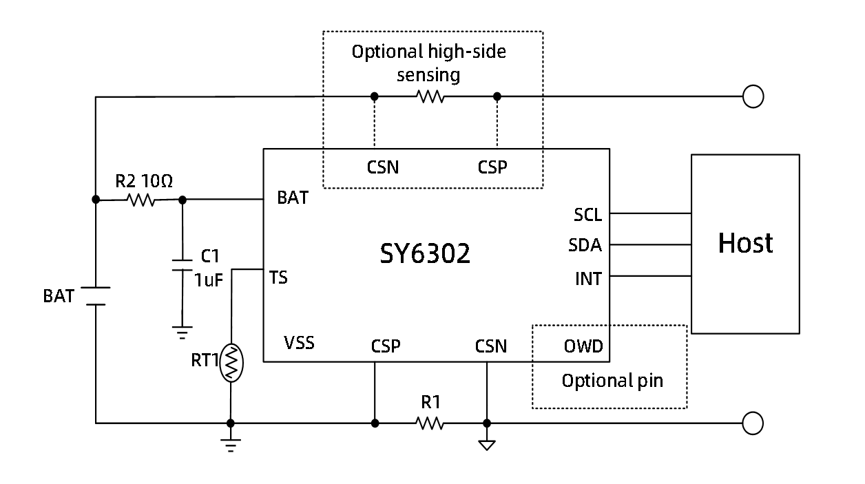 The SY6302 tracks battery operating conditions and performs an algorithm to calculate the SOC(state of charge).