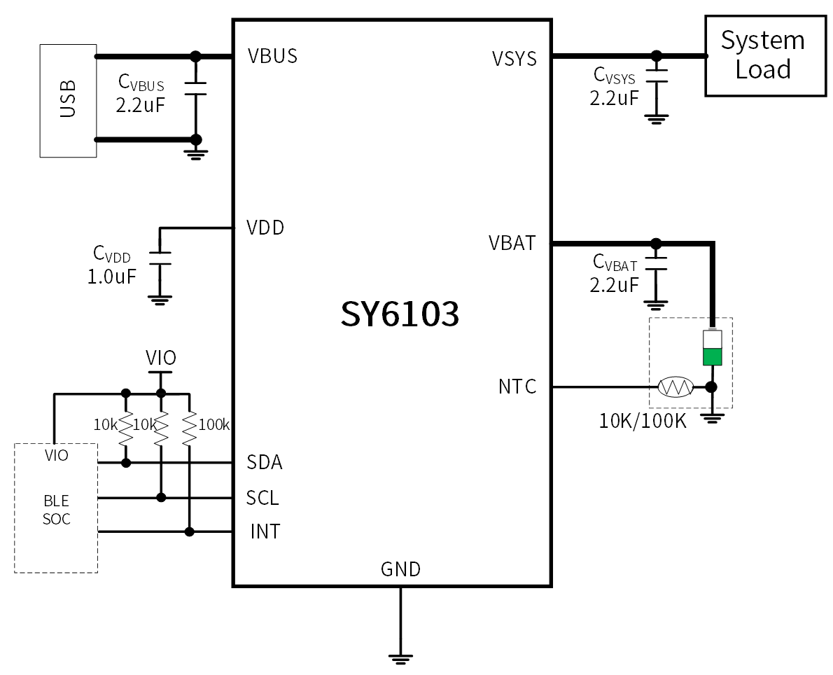 The SY6103 can automatically complete charger phase include pre-charge, fast charge, charge termination. Also monitor battery temperature during charging. Power path management will provide higher priority system load even with depleted battery.