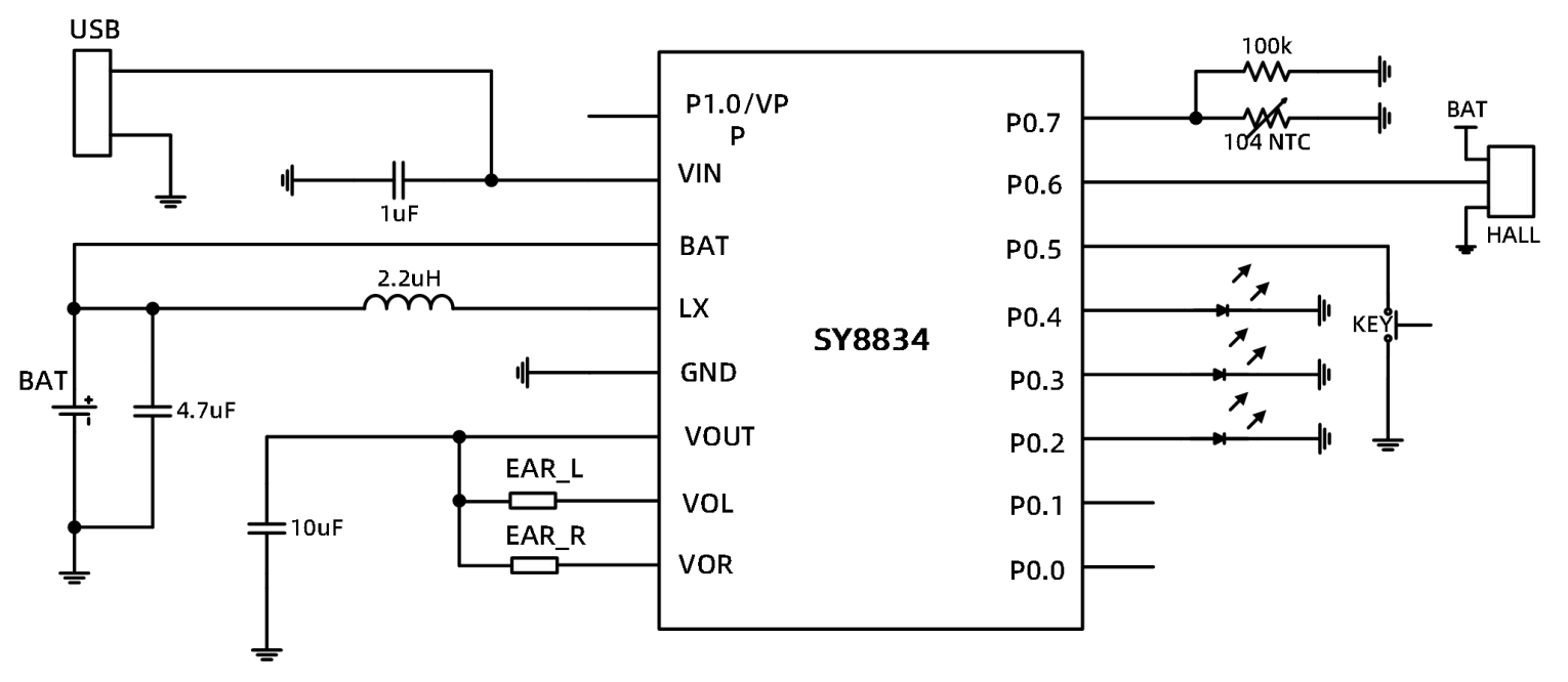 SY8834是专门为TWS耳机充电仓设计的全集成SoC芯片。SY8834内部集成了兼容8051指令集的CPU,256字节RAM, 4k字节OTP程序存储区,多通道10位ADC,9个GPIO,一个线性充电模块,一个Boost升压模块和两个独立放电控制MOS管。SY8834芯片VIN管脚支持过压保护,最高耐压可达35V。