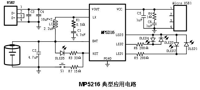 MP5216是一款专为移动电源设计的单芯片解决方案IC,高度集成了开关充电管理模块、LED电量显示模块、同步升压放电管理模块的移动电源管理芯片。MP5216最大充电电流可达到2A,同步升压输出电流最大可达到2.1A。此外MP5216还集成了放电路径管理、电量显示、手电筒等功能,极大简化了外围电路与元器件数量。针对大容量锂电池(锂离子或锂聚合物)的移动电源应用, 提供最简单易用的低成本解决方案。MP5216采用的封装形式为ESOP8。