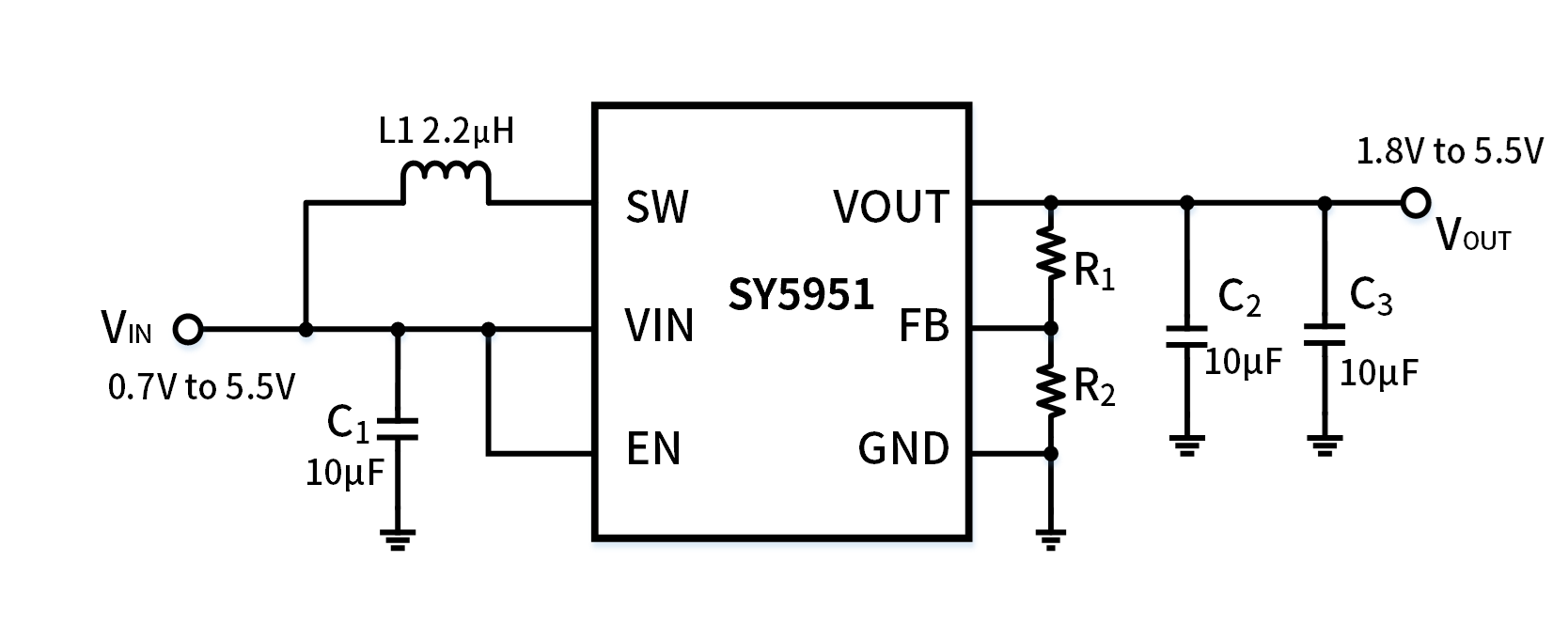 SY5951升压转换器可在静态电流最低的情况下实现最高效率。该器件在轻载条件下消耗1µA静态电流;当负载为10µA,固定输出电压版本时,可实现高达75%的效率。该器件在3.3V至5V转换过程中的输出电流高达300mA,在200mA负载条件下可实现高达93%的效率。