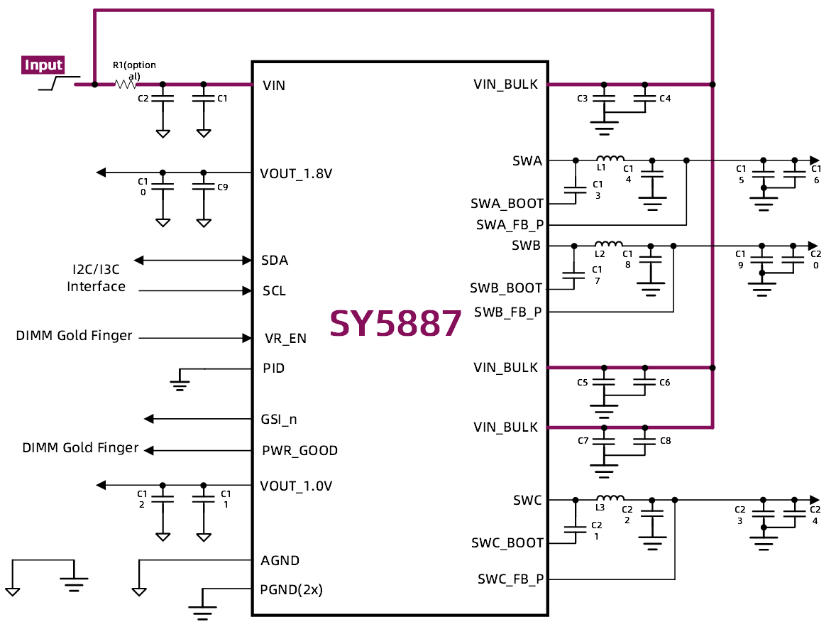 VOUT_1.8V/VOUT_1.0V LDOs are intended to power supply SPD hub and Temp Sensor on DIMM. SY5887 is available FC-QFN28 3mmx4mm package, and is halogen and lead free, compliant with RoHS.