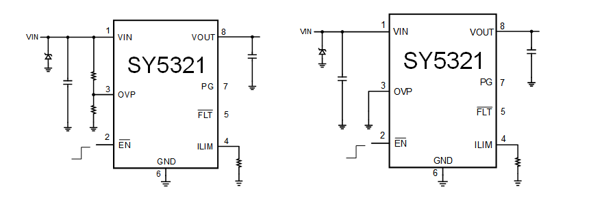 SY5321是一款具有输入欠压和过压保护、负载电流异常保护以及过温保护等特点集一身的高集成IC。SY5321应用于充电电路或低压系统的前端,以避免锂电池或低压系统免受异常输入故障的影响,可承受高达30V的异常输入电压。SY5321可以通过OVP引脚设置外部的输入过压阈值,也可以选择IC内部设定的输入过压阈值。当IC内部设定的输入过压阈值小于OVP引脚设置的外部过压阈值时,SY5321将自动选择内部过压阈值;反之,则选择OVP引脚设置的外部过压阈值。